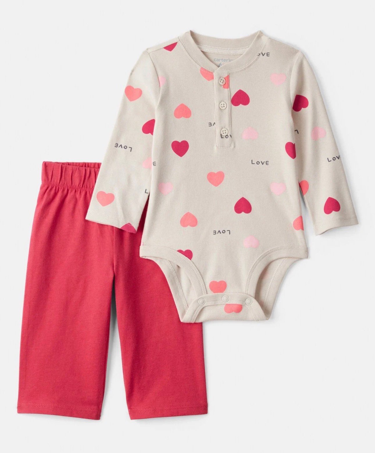 Dress your baby girl in style with this delightful 2-piece heart bodysuit and pant set. The vibrant red color, complemented by a sweet heart pattern, adds a festive and cheerful vibe to her wardrobe.